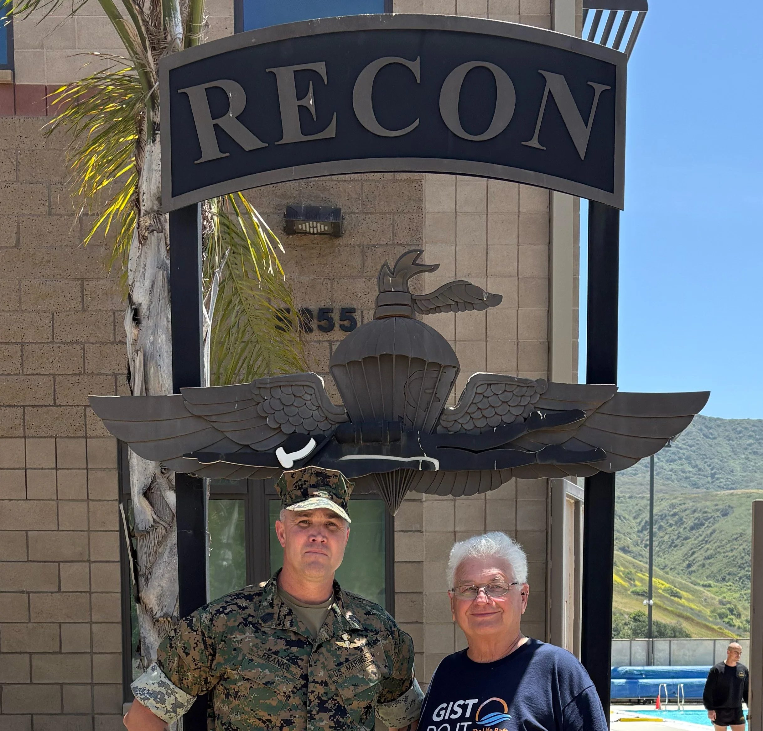 Today is starting out to be a pretty special day for me. I made into California yesterday and am staying with my second cousin Jake and his family in Temecula California. Jake is a master gunnery sergeant in the Marine Corps. MGySgt Jake Franks is the top enlisted person at the Reconnaissance Training Company at Camp Pendelton. Jake took me on a tour of the Recon Training Company’s facilities and introduced me to many of the training staff NCO’s and officers. As a former Recon Marine, it was fascinating to see how far the training, equipment and tactics have come since I served (79-82).